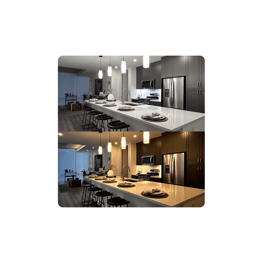 気分やシーンに合わせて、照明を自在にカスタマイズ。 同じ広さの同じしつらえの部屋が、仕事に集中できるオフィスにも、落ち着いた雰囲気のバーのような空間にも早変わり。 アプリ操作も不要で、日々の暮らしに自然と溶け込みます。